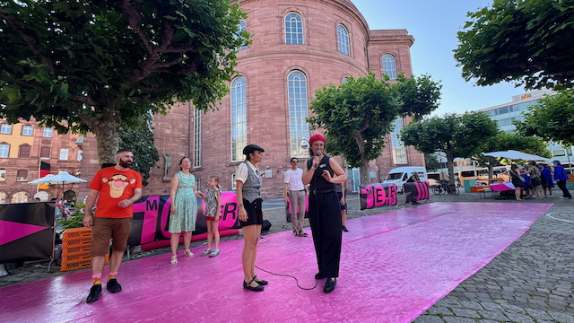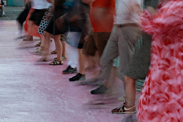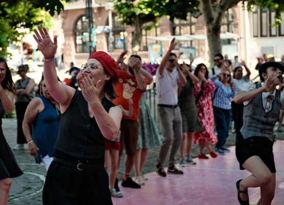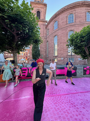 100 Jahre Arbeiterolympiade Frankfurt. CHARLESTON DER VIELEN mit Giuseppina Galloro und Wiebke Dröge, Paulsplatz Frankfurt. 100 Meter vorwärts, redpark.